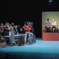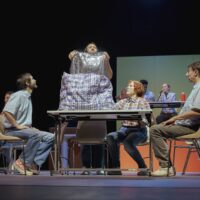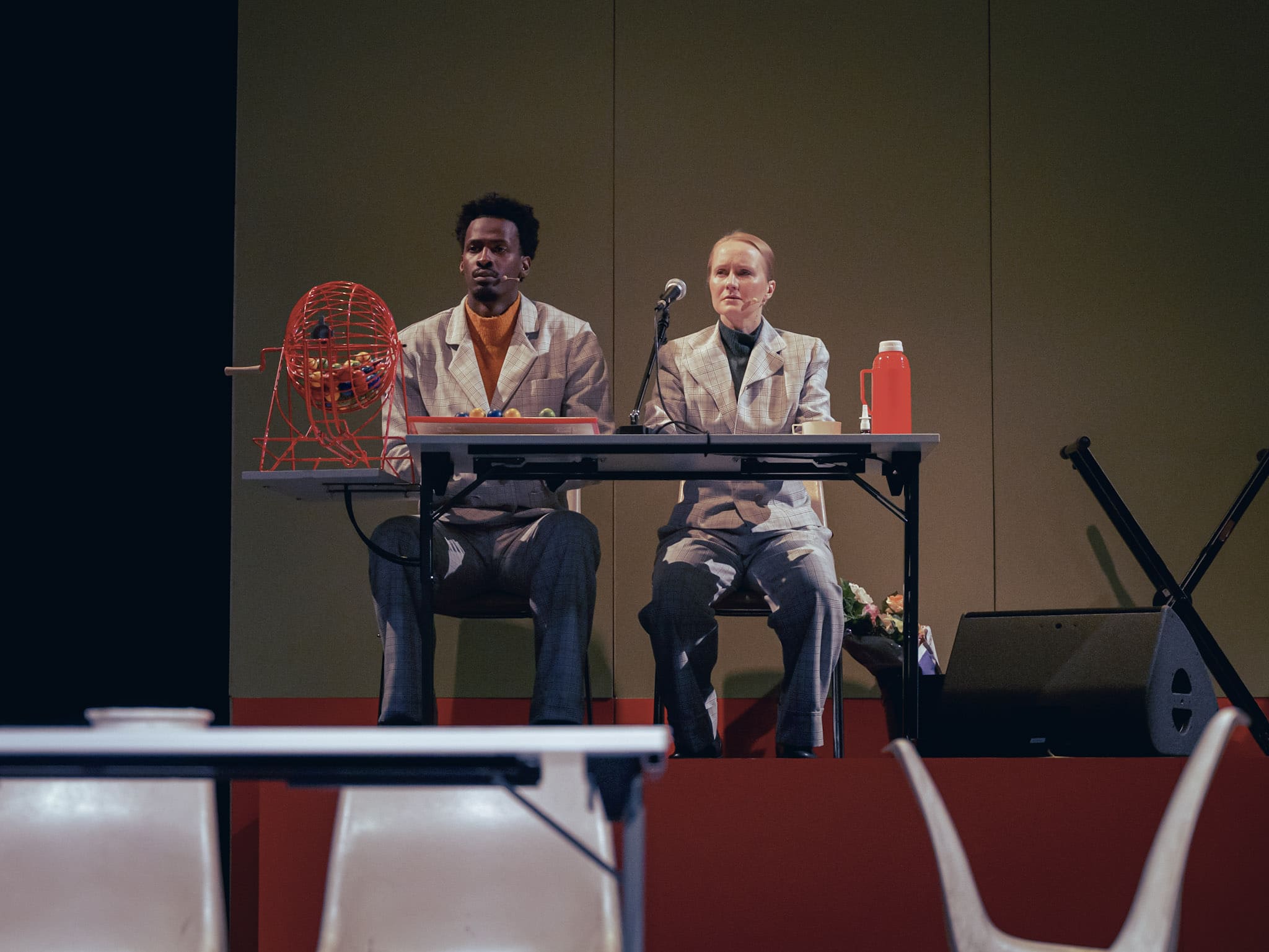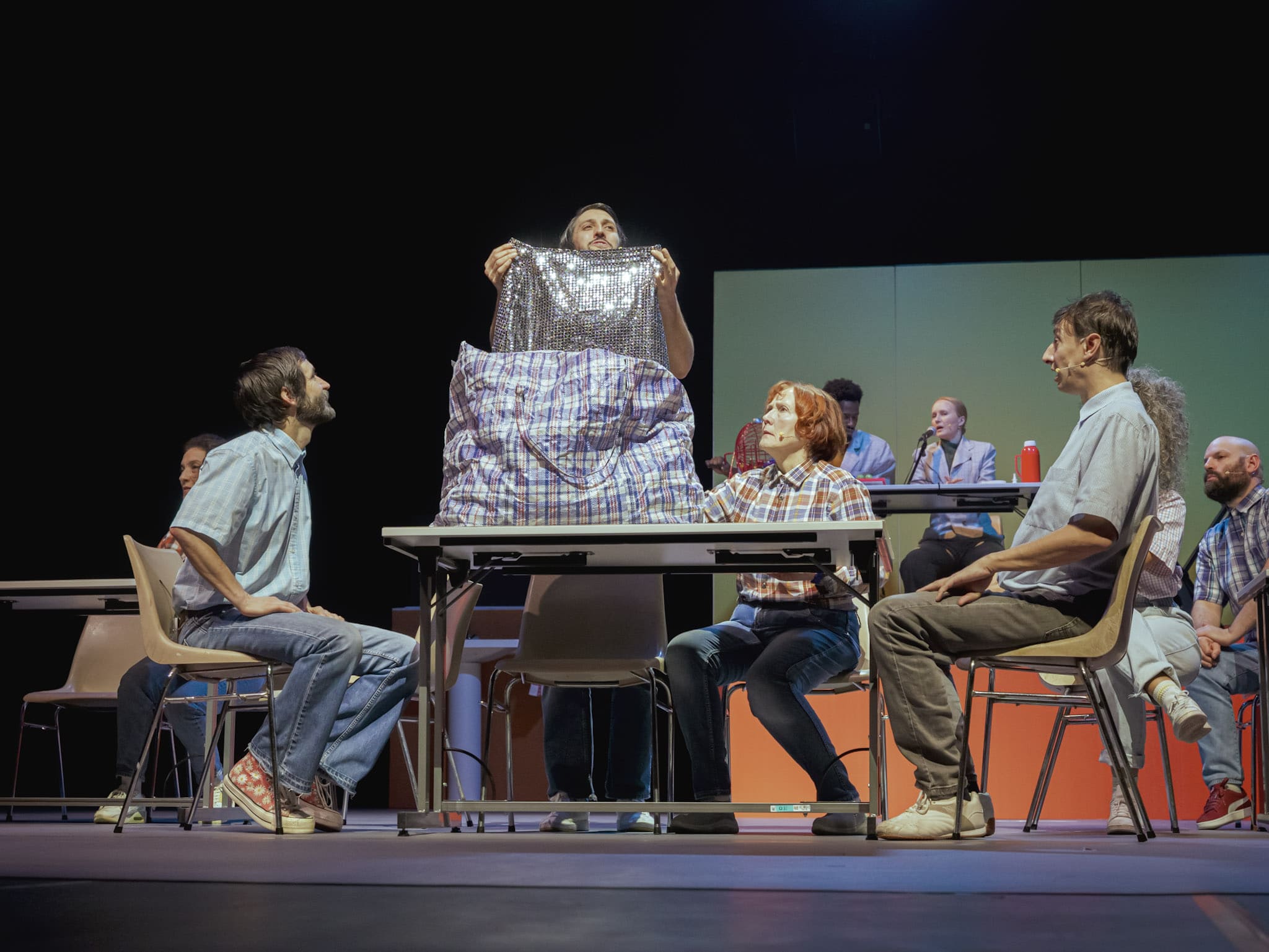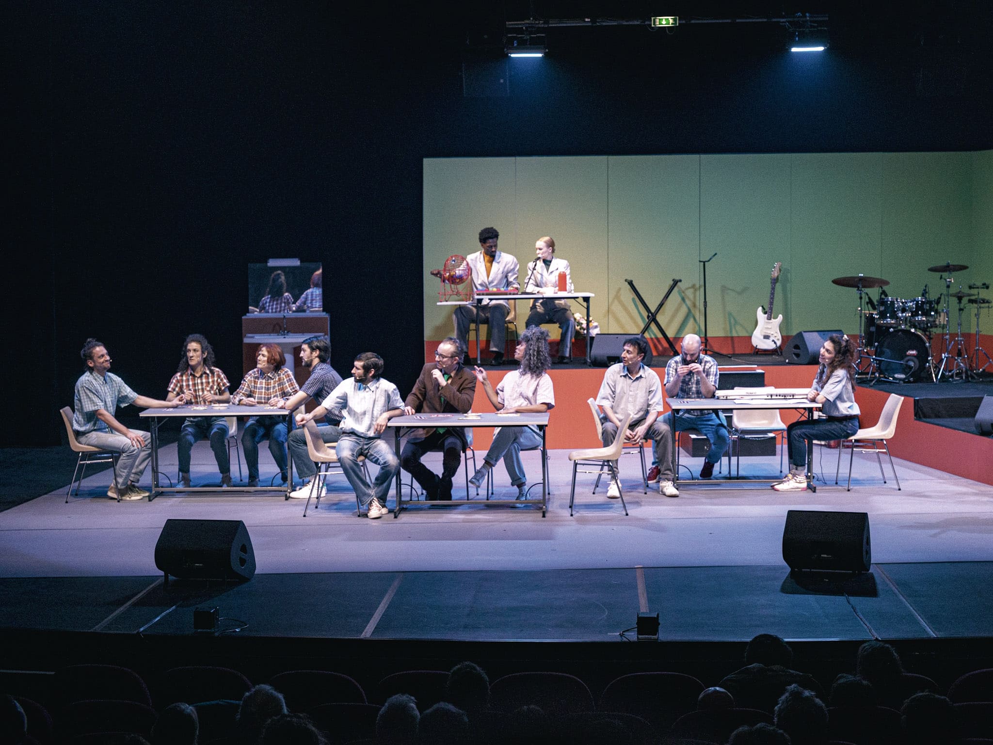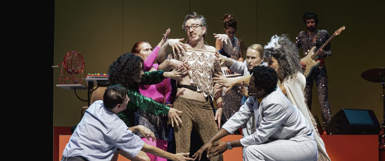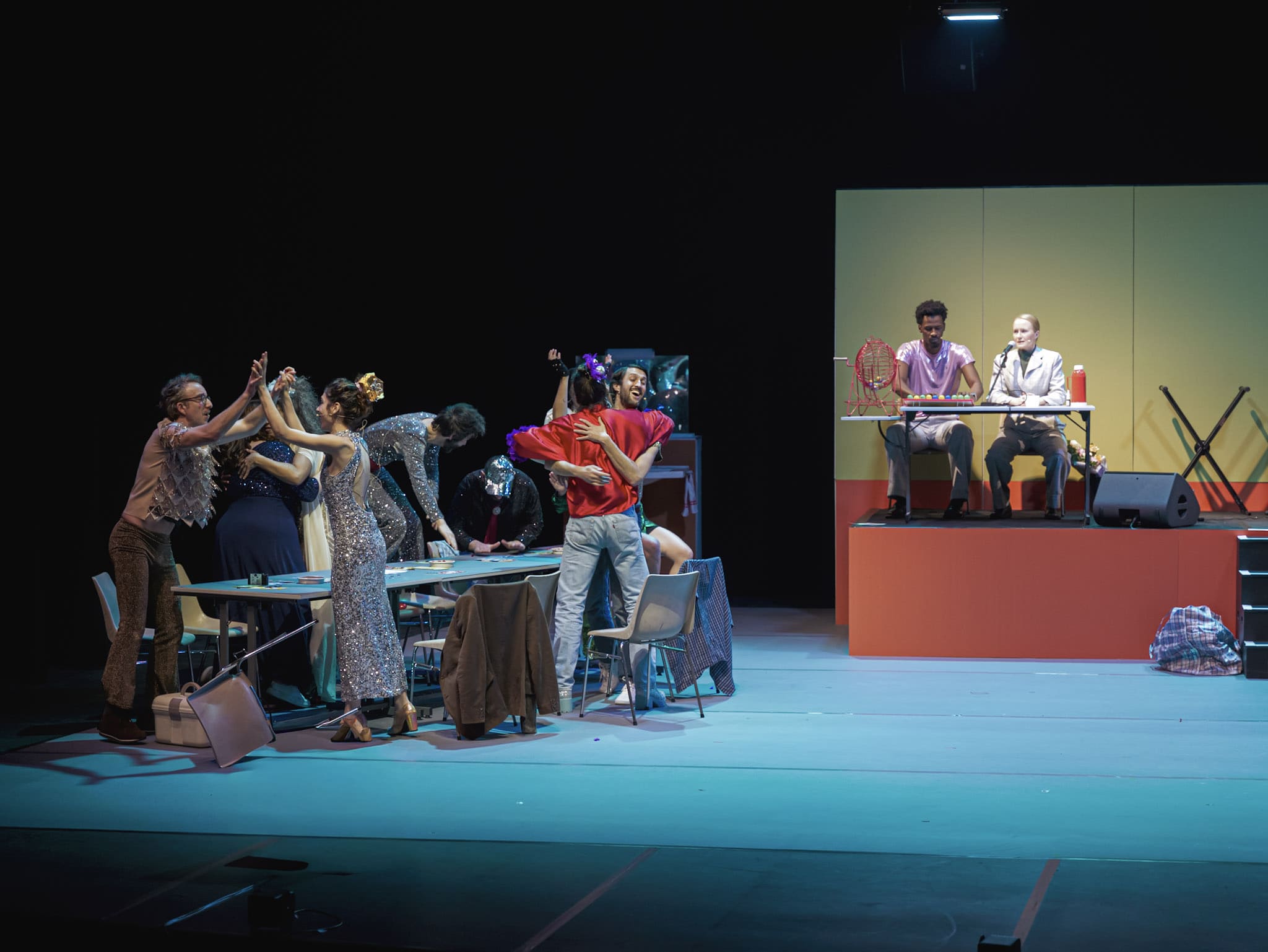 To explore this inscrutable mystery, Franco-Finnish playwright and director Nicole Genovese sets her new play in the basement of a community hall and entrusts 14 performers with bringing to life slightly disillusioned characters from working-class backgrounds. A neo-absurd and genuinely comic choral social fresco, bathed in a flood of garish colors and kitschy costumes, Diskoteekki decidedly turns its back on melancholy.
